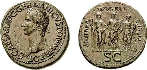 Roman sestertius depicting Caligula, ca. 38 CE. The reverse shows Caligula’s three sisters, Agrippina, Drusilla and Julia Livilla, with whom Caligula was rumoured to have carried on incestuous relationships.