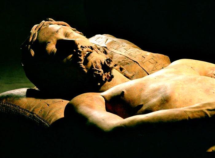 Detail of the dead Christ from Niccolò dell’ Arca, Lamentation over the Dead Christ, 1463, polychromed terracotta, Pinacoteca Nazionale, Bologna.