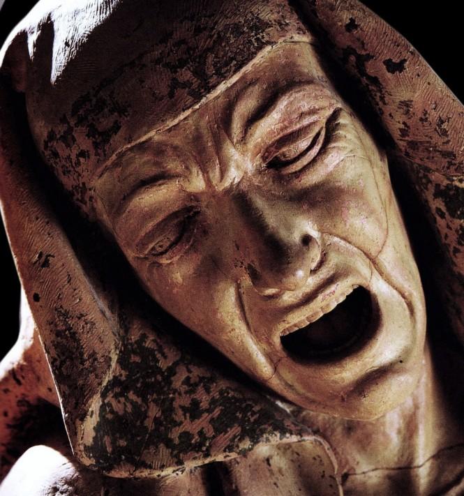 Detail of The Virgin Mary from Niccolò dell’ Arca, Lamentation over the Dead Christ, 1463, polychromed terracotta, Pinacoteca Nazionale, Bologna.